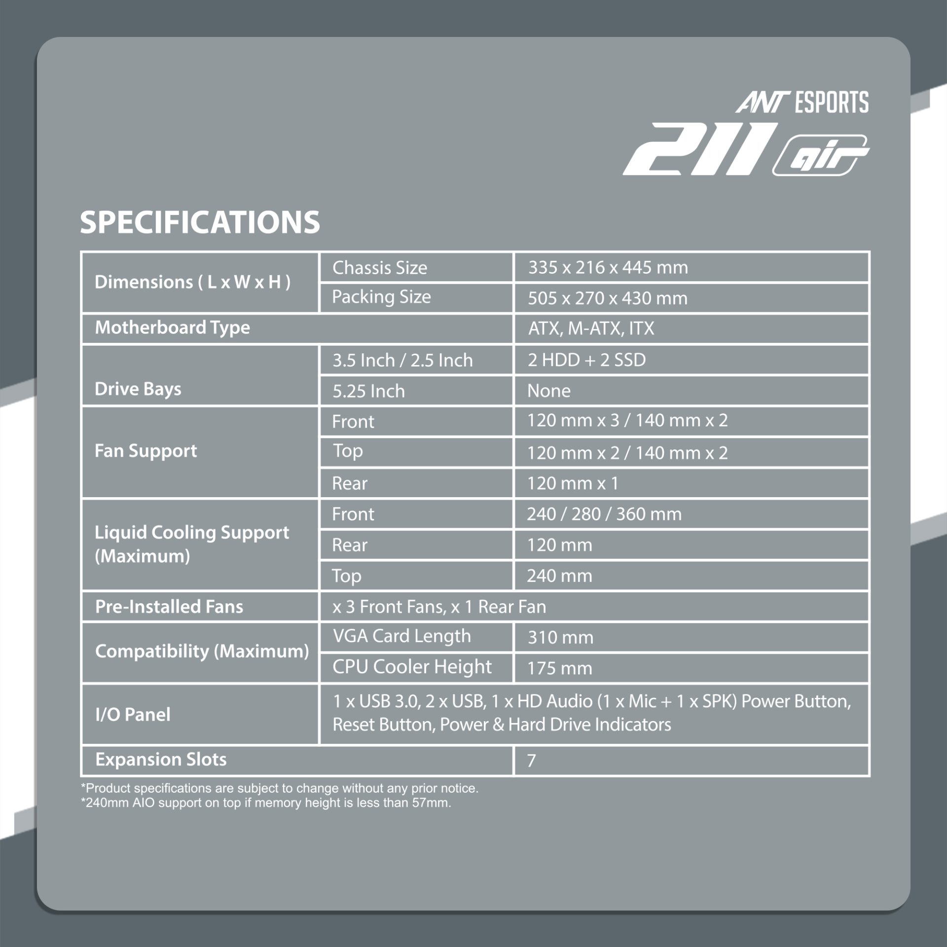• Motherboard Compatibility: The Ant Esports 211 Air is ready for a variety of gaming setups, supporting up to ATX motherboards. Whether you’re building a powerful gaming rig or a versatile workstation, this case has the space and compatibility you need.