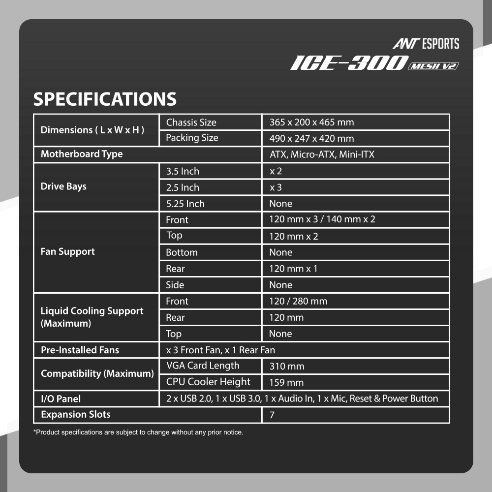 Tailor your storage to your needs with the ICE-300 Mesh V2’s versatile design. The cabinet offers support for either two HDDs or three SSDs, allowing you to store and access your games, media, and files with ease. No more compromises on storage space – enjoy the freedom to install the drives that best suit your requirements.Versatility meets compatibility with the Ant Esports ICE-300 Mesh V2. Compatible with motherboards up to ATX size, you have the flexibility to choose the motherboard that best complements your gaming setup. Furthermore, the cabinet’s liquid cooling support takes things up a notch, accommodating up to a 280mm radiator in the front. Experience top-notch cooling efficiency with liquid cooling solutions that keep your system temperatures low, ensuring smooth and uninterrupted gaming performance.