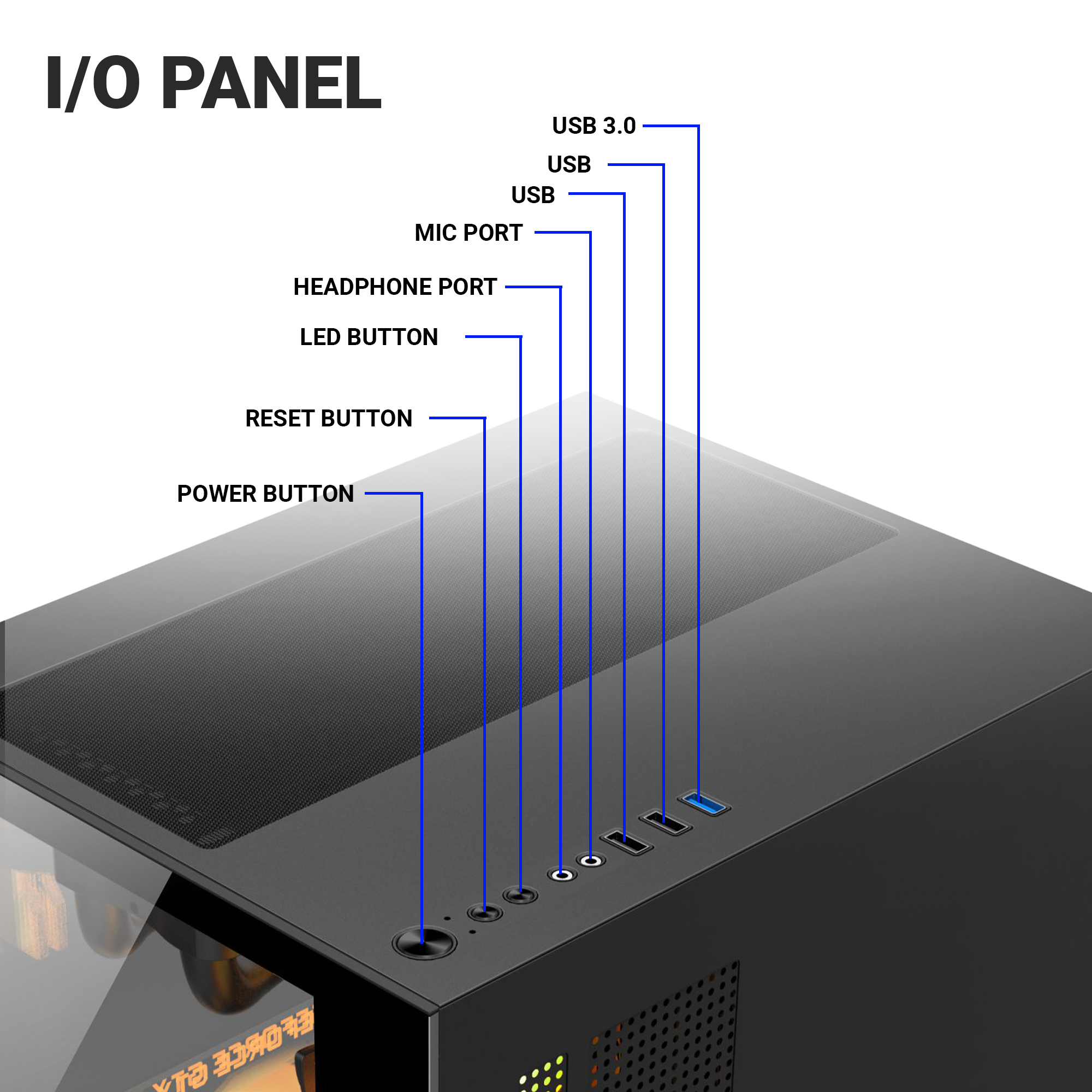 • I/O Panel : 1 x USB 3.0, 2 x USB 2.0, Audio, MIC, LED Control Button, Power Button, Rest Button, Processing & Hard Drive Indicators